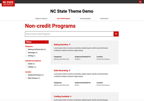 The Non-Credit Programs post type allows you to create a filterable and searchable database of programs that do not lead to credit towards an academic degree.