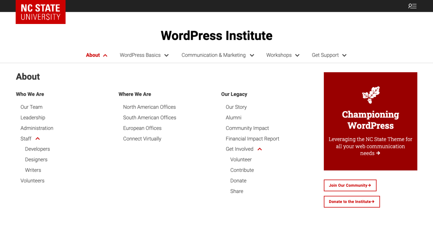 Most sites running the NC State Theme leverage the default WordPress menu. This menu provides a simple navigation bar that displays links arranged horizontally. It also features a dropdown functionality, which allows users to organize related pages under parent items vertically
