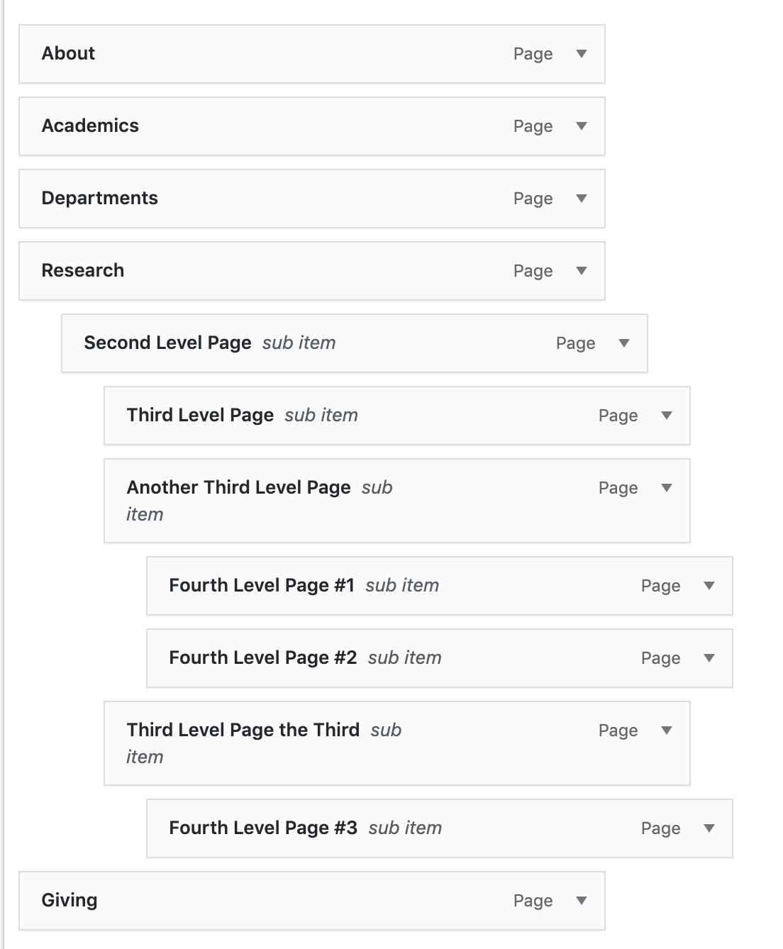 Once the menu items have been added to the menu, click and drag each sublevel item to nest beneath parent items at the appropriate depth. The editing screen will display snap points while dragging to guide the placement of the item. All top level items will become top level nav links, all second level items will become dropdowns to their respective top level nav link, and all third and fourth level items will display only when viewing the 2nd, 3rd, and 4th level pages that those items are children to.